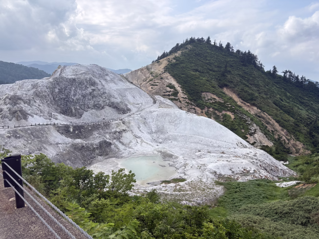 川原毛地獄はこんな感じで山間に湧いている温泉(※👆この辺りは入れません)で、凄い硫黄臭がします。山肌も白いんですよ。