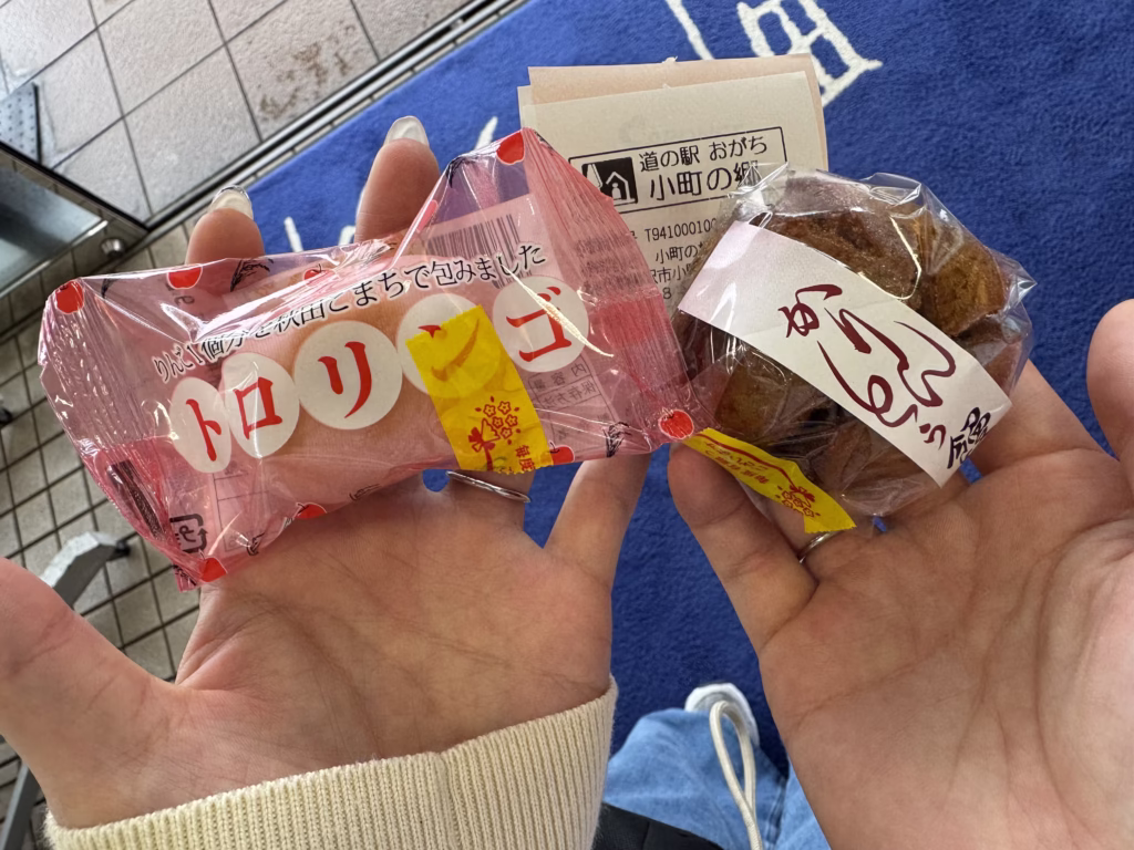 朝ごはん(?)にトロリンゴ(りんごが入った饅頭)とかりんとう饅頭をいただきました。どちらも美味しかったです!トロリンゴは見たことなかったので新鮮?秋田のりんごを使ってるみたいです。
