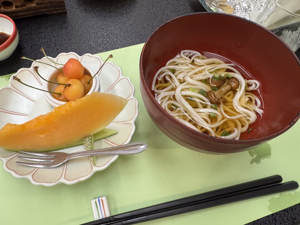 デザートにメロンとさくらんぼが出て来ました!稲庭うどんも!