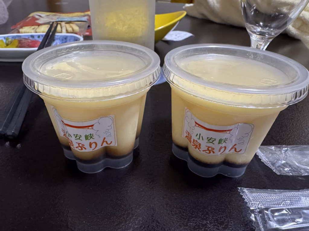 デザート(旅館の前の売店で買った温泉プリン)も食べて