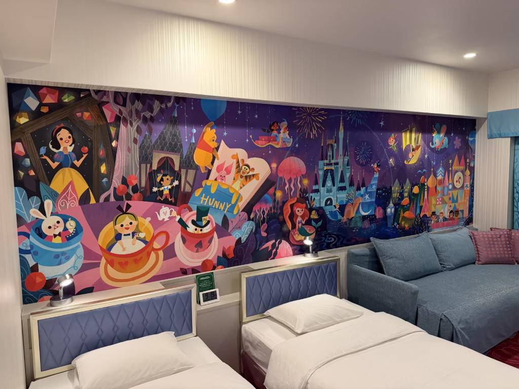 客室もこんな感じで壁一面にディズニーキャラクターが描かれていて、テンション上がります!