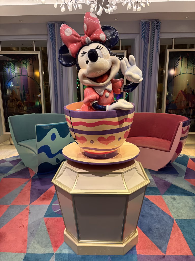 私たちはウィッシュの方に泊まりましたが、こちらの方が少し可愛い雰囲気になっていてフロントではミニーちゃんが出迎えてくれます。ディスカバーはミッキーかな?