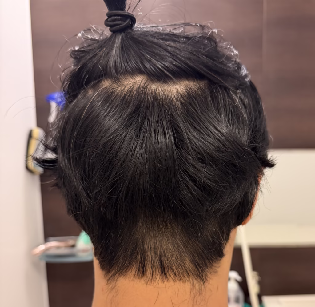 襟足の真ん中付近のちょっと上から入って、少し禿げた感じになってますね笑